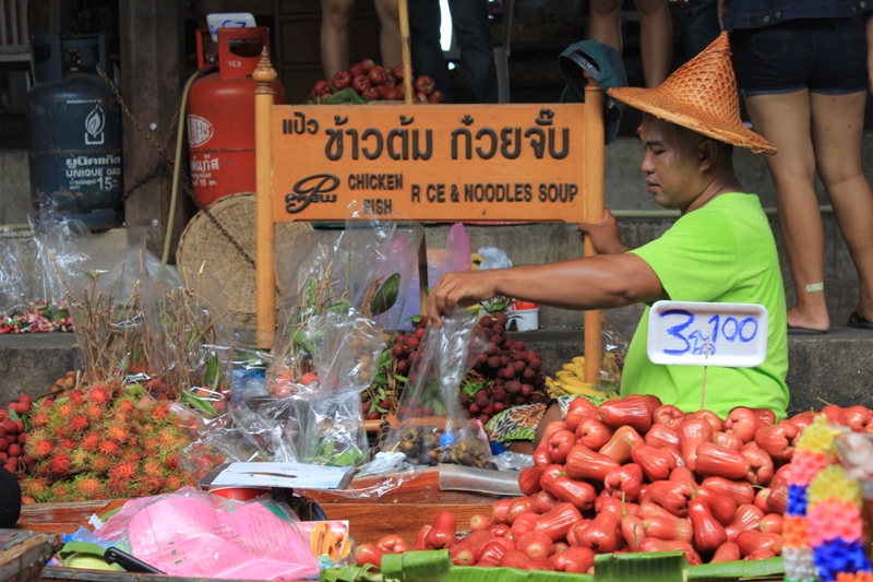 Tukang perahunya sibuk menawarkan untuk singgah membeli souvenir ataupun makanan, namun kami menolak dan menyampaikan bahwa kami hanya ingin melihat-lihat saja. Kalau soal harga, kelihatannya gak murah-murah amat, contoh jambu merah ditawarkan 100bht untuk 3 buah.