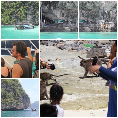 Kami diberi waktu untuk berenang disini kurang lebih 40 menit. Guidenya menyarankan agar kami mematuhi jadwal yang ditentukan, agar bisa duluan ke tempat berikutnya dengan nyaman. Saat tiba di Phi-phi Lay speed boat yang ada bisa dihitung, begitu sepuluh menit kemudian, pantai penuh dengan speedboat dan ribuan orang. Padahal pantainya gak panjang. Kemudian kami singgah photoshop di suatu pantai yang lupa namanya, terus ke Monkey Beach. Monkey Beach adalah pantai dimana banyak monyet disini. Sy gak turun, hanya motret dari kapal. Monyet mah banyak di Indonesia. Singgah photoshop di depan Viking Cave. Setelah itu speed boat berhenti untuk memberi kesempatan snorkling sekitar 1 jam. Hehe, hanya kami yang pake baju pelampung, maklum belum mahir berenang. Menurut saya, snorkling di Tg. Karang (Palu) lebih menyenangkan dari tempat ini. Disini banyak bulu babi, yang banyak menusuk bule-bule itu. Makanya sy hanya sebentar, sy gak nyaman melihat banyak bulu babi di karang-karangnya dan lagi gak terlalu suka pake baju pelampung.