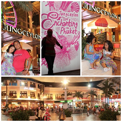 Malamnya, kami ke Jungceylon Mall. Dari hotel jalan kaki sekitar 700m, lumayan juga sih. Tapi gak berasa karena sepanjang jalan banyak kedai-kedai souvenir, jadi sambil jalan sambil melihat-lihat. Saya suka suasana Jungceylon Mall ini, happening area banget dan asik. Tapi karena waktu gak banyak dan bawa anak-anak, jadinya sy ke carrefour. Ternyata banyak oleh-oleh yang bisa dibeli disini, baju kaos Thailand (lebih murah dibanding di beli di Bangkok), makanan/cemilan seperti kripik durian, asem thailand. Sy juga beli beras ukuran sekilo. Lho kok beli beras? Hehe, harap maklum kami traveler paket hemat, jadi makannya subsidi silang. Sebagian makan di luar sebagian lagi masak-masak dengan travel cooker yang saya bawa. Atau sisa beli lauk, nasinya masak sendiri. Dan juga karena bawa anak-anak, jadi harus siap sepanjang waktu dengan nasi. Dari Indonesia, sy udah nyiapin beberapa makanan praktis seperti abon dan indomie.