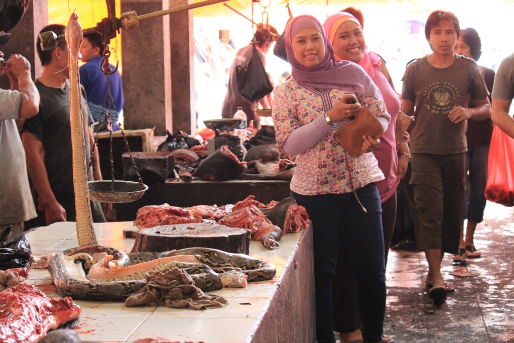 Hawa amis menusuk hidung dan pemandangan yang bikin mual pada saat memasuki area penjualan daging hewan di Pasar Beriman, Tomohon. Deretan daginghewan-hewan yang tidak lazim dikonsumsi berjejer rapi, mulai dari daging ular, anjing, tikus, kelelawar, monyet, babi, bahkan kucing. Namun bau amis terpaksa ditahan tanpa tutup hidung dan ekspresi dibuat biasa-biasa saja, kuatir membuat ketersinggungan para penjual disana. Para penjual disana sudah terbiasa dengan kehadiran turis lokal dan mancanegara yang datang hanya sekedar melihat-melihat bahkan bagi yang berjilbab seperti saya. Mereka sangat welcome, bahkan senang diajak berfoto.