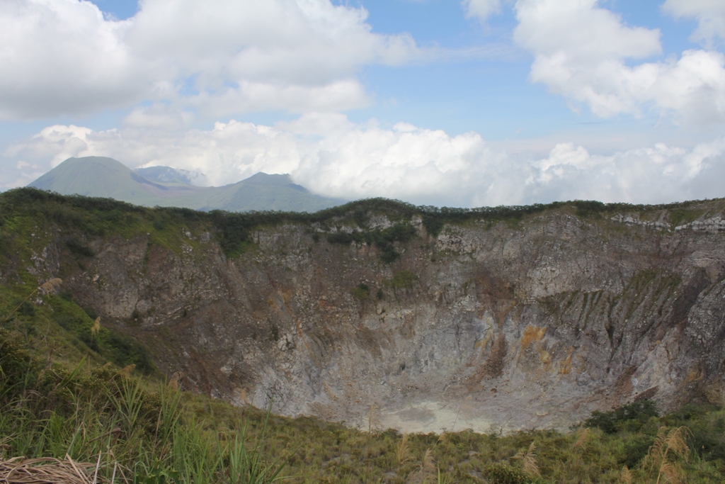 Gunung Mahawu berbentuk lingkaran dimana di tengahnya berupa kawah. Kami lalu melanjutkan jalan menuju titik tertinggi itu dimana bendera merah putih berada. Ada jalan setapak kecil menuju kesana. Awalnya kami ragu-ragu, karena jalan setapak itu nyaris tertutup dengan semak belukar. Namun dengan menguatkan hati masing-masing dan berdoa sepanjang jalan, kami jalan. Dan sampai juga kami ke bendera itu. Pemandangan cukup indah menawan dengan angin segar berhembus pelan. Disini kami bertemu dengan sepasang turis asal Swiss yang melakukan perjalanan 3 minggu ke Asia Tenggara, minggu pertama di Myanmar, minggu kedua di Indonesia akan seminggu di Manado untuk scuba diving. Minggu terakhir, akan melanjutkan ke negara lain sebelum kembali ke negaranya. Kami cukup lama bersantai disini, memakan bekal yang ada. Dan setelah turis yang tadi, masih ada beberapa grup turis baik yang bertemu di puncak maupun berpapasan pada saat jalan turun.
