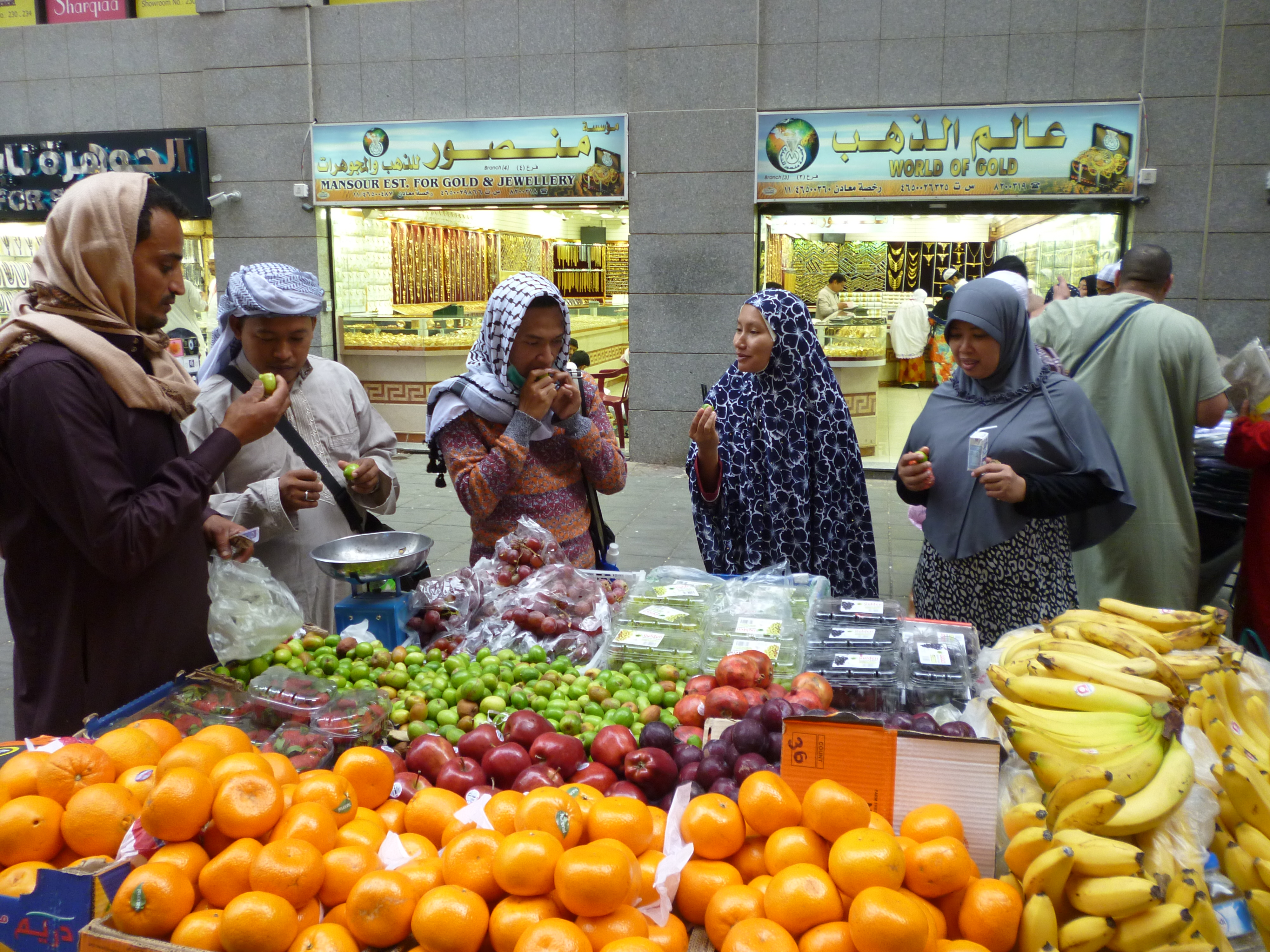 Buah-buahan juga banyak dan beranekaragam. Di jalan menuju masjid Nabawi, pedagang kaki lima menjajakan buah-buahan seperti anggur, mangga, apel, jeruk, plum, delima, pisang dan sebagainya. Belinya bisa dicampur-campur. Di beberapa mini market, ada yang sudah dipack dalam 1 kemasan yang terdiri dari berbagai macam buah harganya 10 real. Anggur harganya 15 real/kg. Teman saya malah beli jeruk sunkist 1 dos, isinya sekitar 25 buah dengan harga 20 real saja.