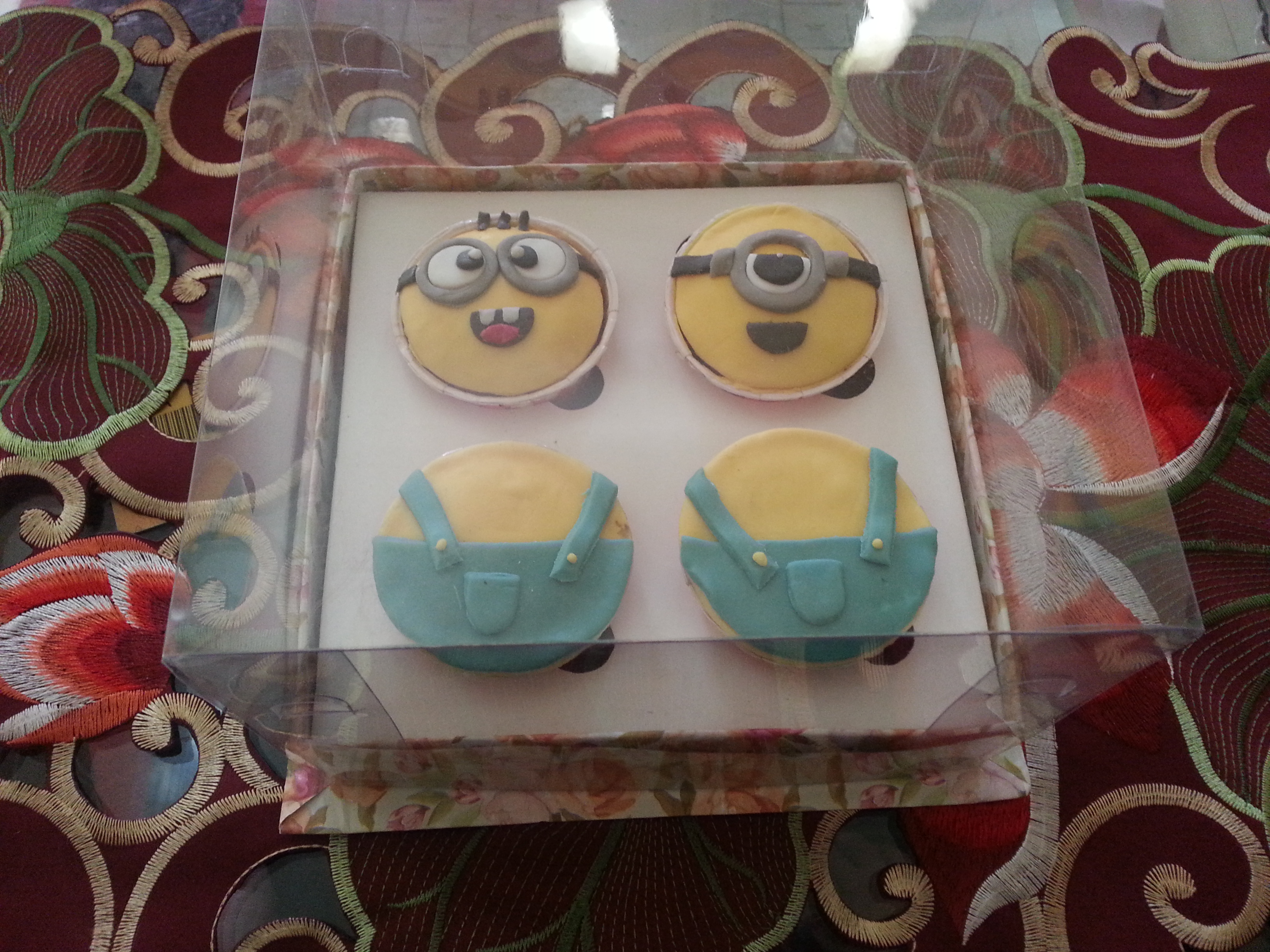 Dekorasi menggunakan fondant 250 gr hanya cukup untuk mendekor 10 cup cake, sisa cupcake mau di dekor pakai buttercream tapi saya sudah gak punya energi lagi. Ada sedikit kesalahan dalam dekor, harusnya fondantnya harus menutupi sampai pinggir luar cup-nya. Udah bikin 3, mau di perbaiki, fondantnya sudah lengket di cakenya, kepala minion jadinya gak terlalu sempurna. Next trial will be better.
