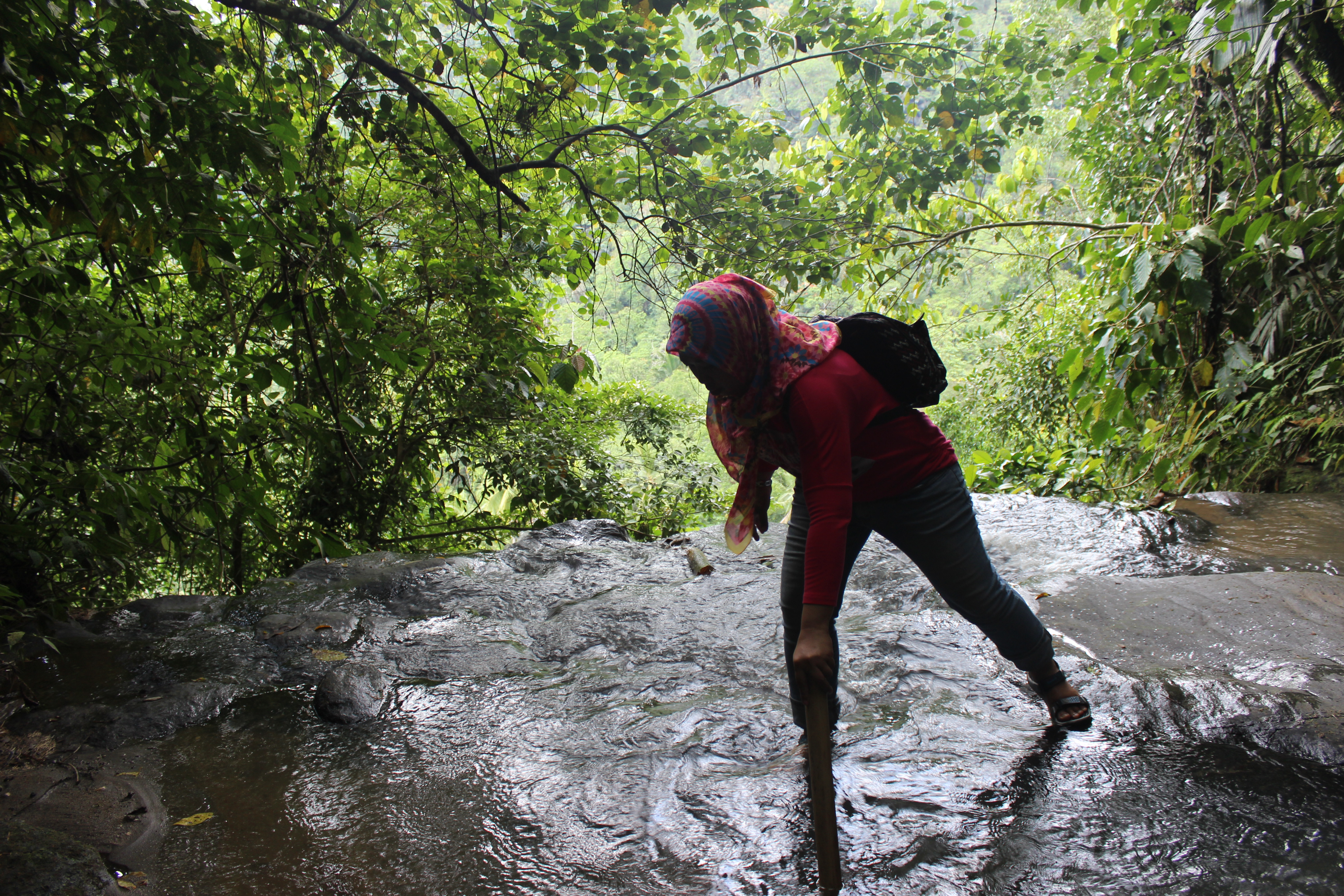 Air terjun Kiawa letaknya di Minahasa sekitar 45km dari Manado. Air Terjun Desa Kiawa ini bagian dari wilayah Taman Wisata Alam Laun Dano Kiawa, melewati Taman Wisata Rohani Goa Madona Maria, dan Hutan Wisata Kalpataru. Informasi yang didapat sangat minim dan gak banyak orang yang berminat kesana. Setelah tanya sana sini, sampailah kami ke jalan buntu dimana terdapat semacam sekolah pastori atau seminari. Gak ketemu lagi orang yang bisa ditanya, kami tetap jalan mencoba menebak-nebak apakah kami sudah berada di jalur yang tepat. Tak lama berjalan, kami bisa mendengar suara gemuruh air terjun. Dengan berpatokan suara tersebut kami mencari jalan menuju air terjun.