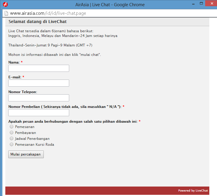 Karena gak ada respons setelah 5 hari, saya kemudian menggunakan saluran pengaduan yang ketiga via live chat. Tidak mudah dapat slot untuk live chat http://www.airasia.com/id/id/live-chat.page, harus sabar menanti. “Kami sedang mengalami jumlah chat yang tinggi. Mohon agar dapat mencoba kembali nanti dan kami mohon maaf atas ketidaknyamanan yang terjadi”.