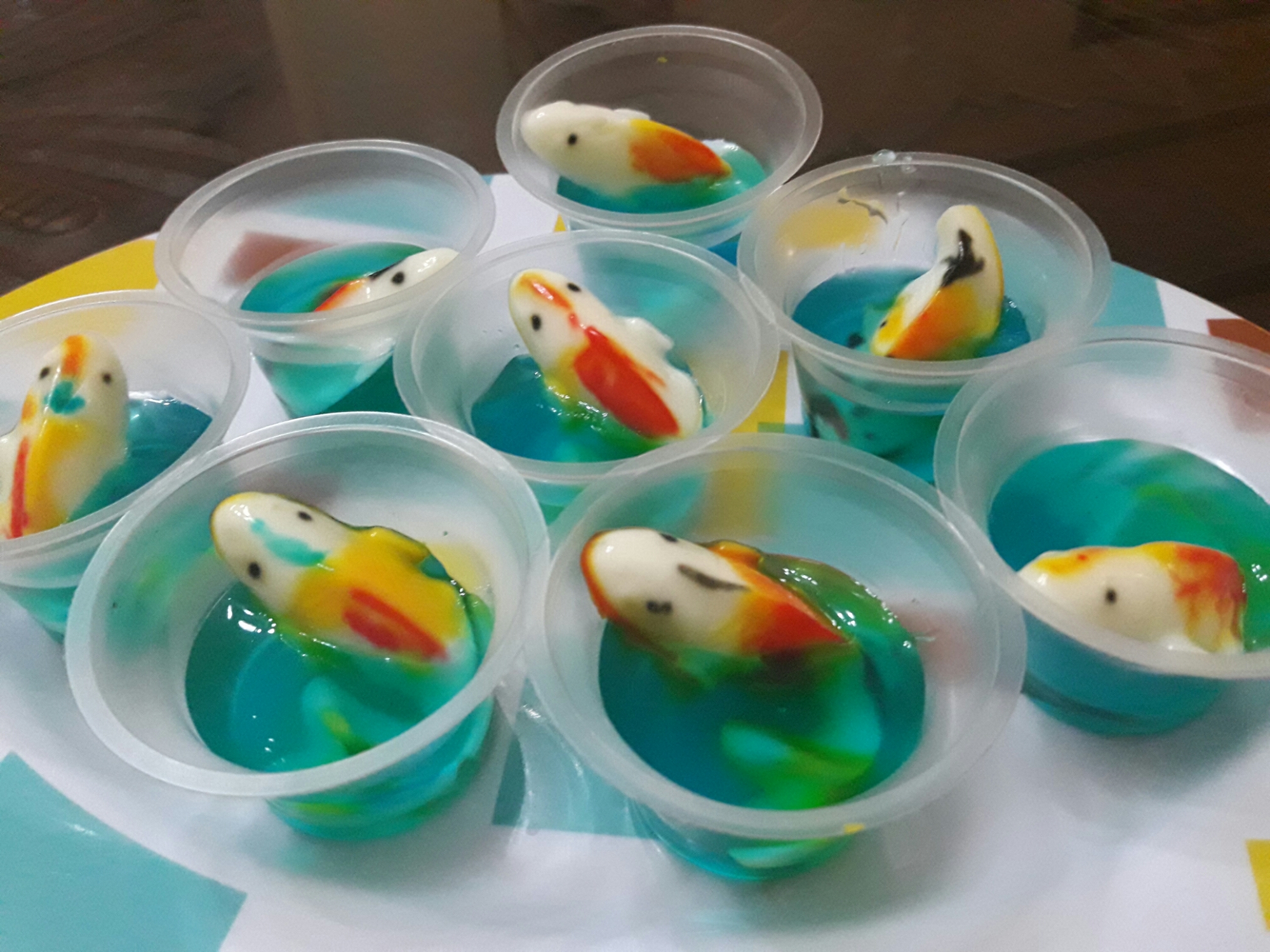 Pengennya ikan koi berbaring diatas jelly. Tapi cupnya kekecilan, jadinya sebagian badan ikan koi saya celupkan ke dalam kolam.