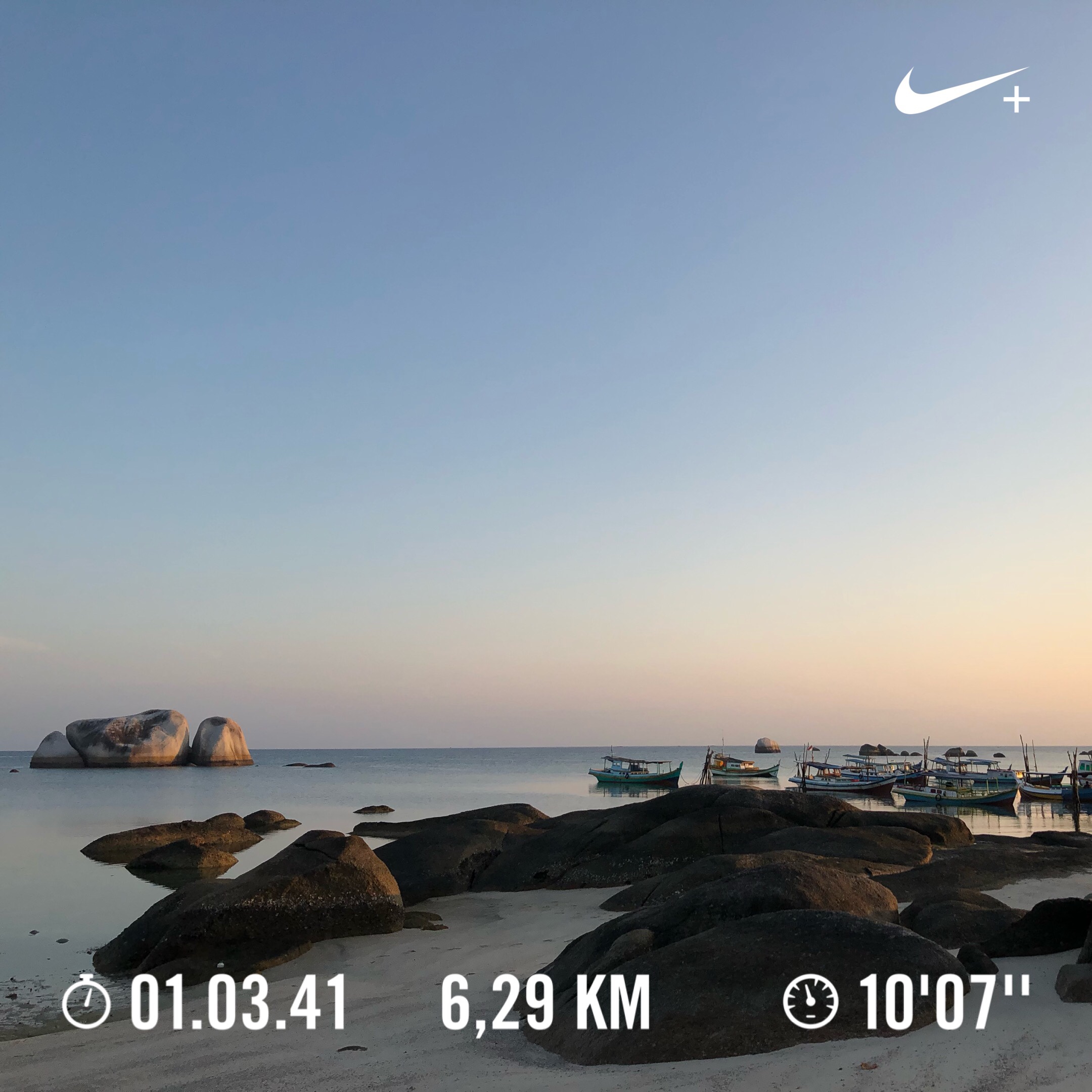 Kemarin, latihan easy run di Belitung. Dari hotel Santika ke Pantai Tanjung Tinggi. Lumayan ada progress pace yang tadinya 11 jadi 10. Dengan kondisi begini, 21km bisa finish 3,5 jam. Cumah ya harus mengantisipasi faktor lain-lain.