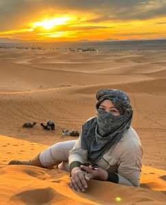 Highlight Morocco adalah tur Sahara. Sempat galau juga antara milih paket standar atau luxury. Yang paket standar referensinya atau reviewnya gak banyak ataupun gak clear. Harga paket standar 3D2N per orang 1,25juta, luxury 2.4juta. Akhirnya milih paket luxury dengan pertimbangan karena tur sahara bisa jadi once in a life time. Perbedaan utamanya: hotel dan tenda glamping beda lokasi dan shared bathroom. Harga paket yang kami dapat ini lebih murah ketimbang paket di getyourguide.Kami dijemput di hotel tempat menginap jam 7 pagi, mobil kapasitas 17 orang. Grup kami ada 2 mobil yang barengan jalan. Ketemu di rest area (pagi dan sore), kemudian bareng-bareng saat day tour selama perjalanan, dan ketemu lagi di tempat makan siang. Jam 5 sore, kami yang ambil paket luxury di drop di hotel duluan kemudian yang ambil paket standar di drop di hotel lain. Hotel tempat kami menginap, sangat nyaman. Sekamar bertiga ( 1 queen bed dan 1 single bed). Makan malam bareng-bareng di dekat perapian rumah, berasa kayak makan malam keluarga, view di roof top cakep, sarapannya juga banyak dan kenyang. Hari kedua, setelah day tour dari pagi sampai sore, jam 4 sore kami didrop duluan di dekat lokasi tenda glamping. Koper-koper diturunkan dan langsung di bawa ke tenda. Lokasi tenda sekitar 1km dari jalan raya. Kami kemudian naik unta. Saya kira kami akan naik unta full selama 2 jam untuk mencapai tenda. Ternyata cuma mutar-mutar tidak jauh dari tenda sambil menanti sunset. Camel guide juga bertindak sebagai tukang foto dan pengarah gaya.