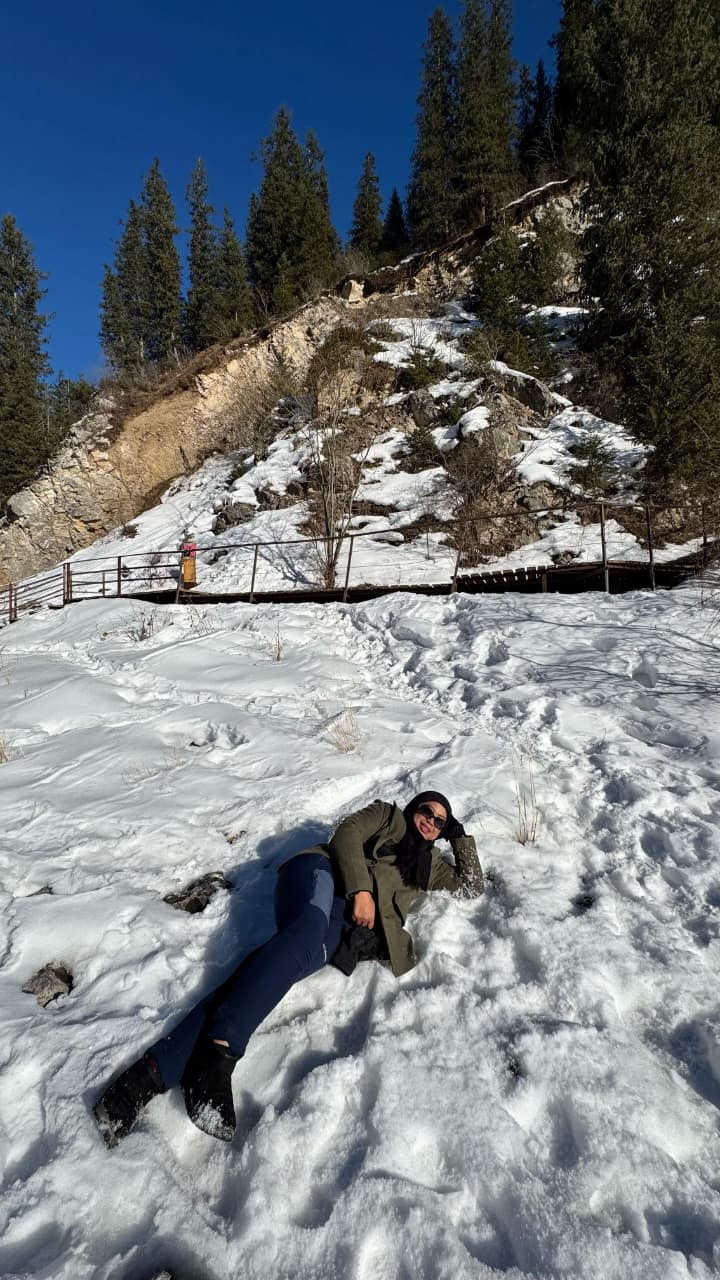 Puncak dari perjalanan ini adalah kunjungan ke Kolsay Lake, sekitar dua jam perjalanan dari kawasan canyon. Danau ini terkenal dengan air birunya yang dikelilingi hutan pinus dan pegunungan Tian Shan. Tapi saat kami datang di awal musim semi, danau masih membeku total! Di sinilah bagian paling seru, kami berjalan di atas permukaan es, berfoto, bahkan sempat tidur-tiduran di atas danau sambil tertawa-tawa menikmati dinginnya udara pegunungan.