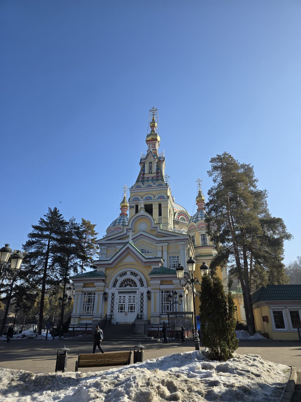 Setelah perut terisi, kami melanjutkan perjalanan dengan berjalan kaki menuju Ascension Cathedral. Langkah demi langkah di atas trotoar bersalju terasa menyenangkan, melewati taman kota. Udara dingin menusuk tapi langit cerah membuat suasana terasa hidup. Katedral yang megah itu berdiri di tengah Panfilov Park, dikelilingi pepohonan yang masih tertutup putih. Warnanya yang mencolok, kuning dan biru pastel, tampak kontras dengan langit kelabu muda dan salju di sekitarnya.