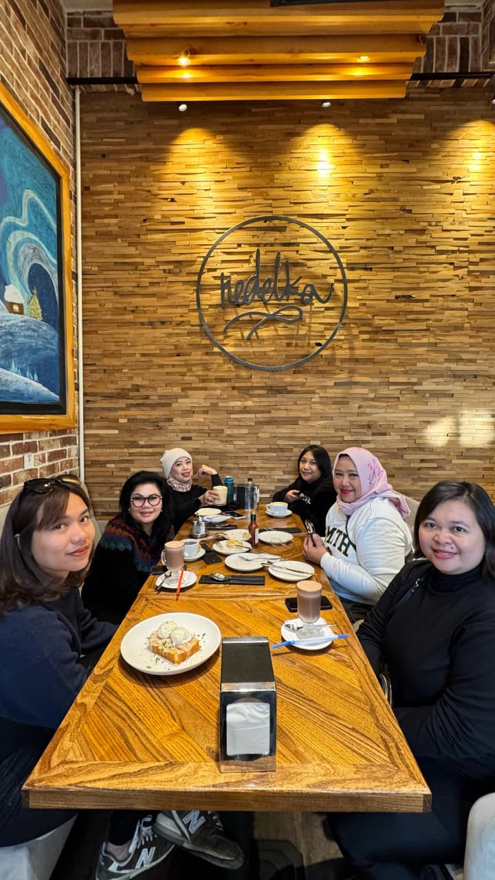 Pagi itu, udara Almaty masih terasa sangat dingin, tapi suasananya begitu menyenangkan. Dari jendela apartemen, terlihat hamparan salju putih yang masih menutupi jalan. Kami memutuskan untuk memulai hari dengan sarapan di Café Nedelka, yang letaknya tak jauh dari apartment tempat kami menginap. Kafe ini punya suasana hangat dan homey, dengan aroma kopi yang langsung mengisi ruangan begitu pintu dibuka. Sepiring roti panggang, telur, pizza, dan secangkir cappuccino jadi teman sempurna untuk pagi bersalju itu.
