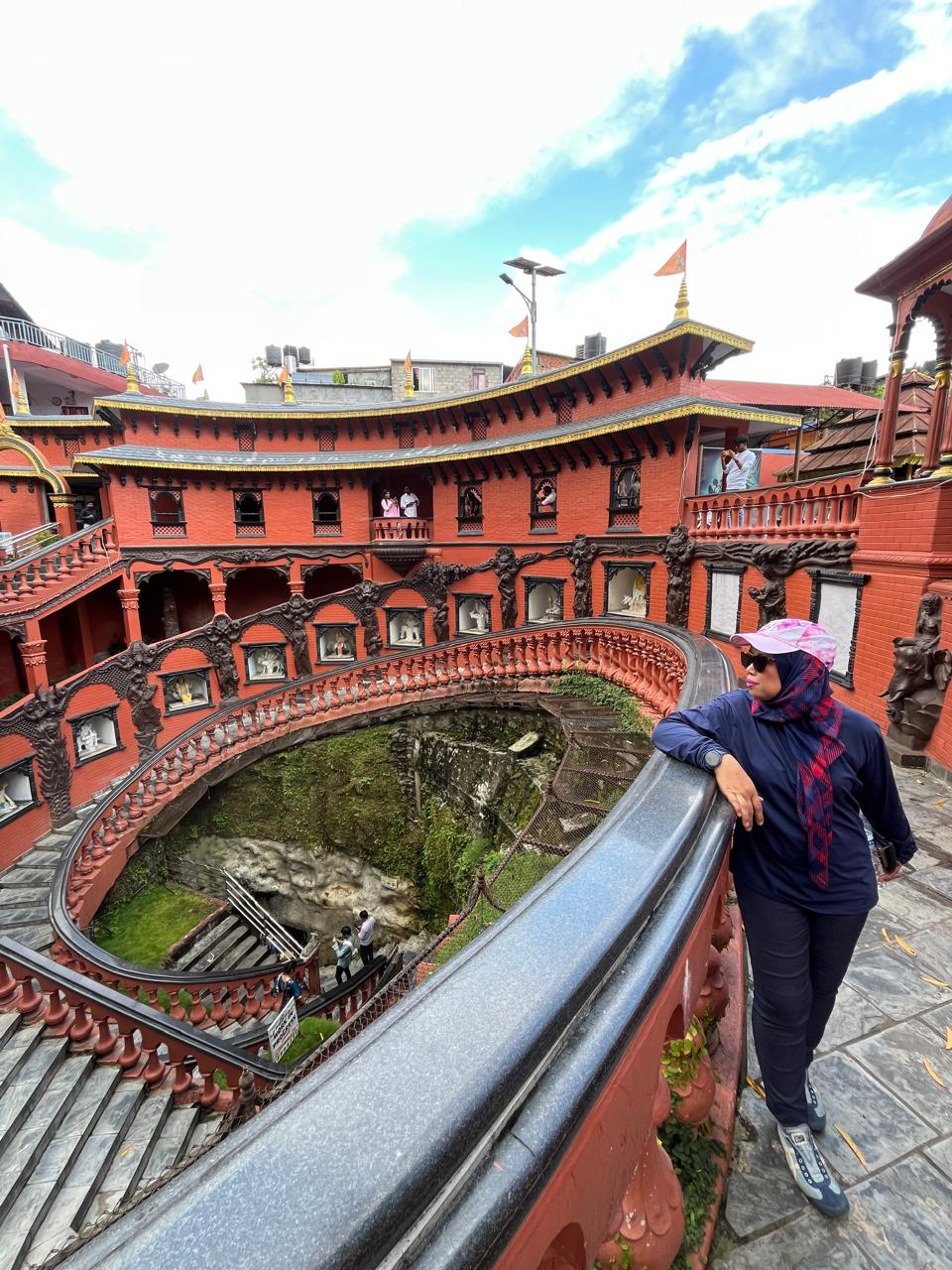Perjalanan dilanjutkan menuruni bukit menuju Devi’s Fall, air terjun yang katanya unik karena alirannya menghilang ke dalam lubang batu besar di bawah tanah. Tapi terus terang, menurut saya tidak terlalu istimewa. Tepat di seberangnya, ada pintu masuk ke Gupteshwor Mahadev Cave. Kami hanya sempat berfoto di tangga melingkar menuju gua dan tidak lanjut turun ke dalam, mungkin karena rasa malas yang tersisa setelah trekking. Padahal dari foto-foto di internet, bagian dalam gua tampak menarik.