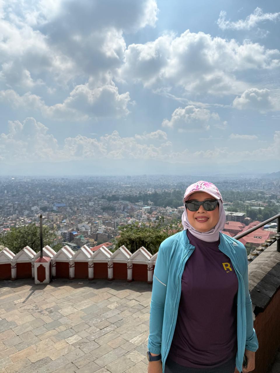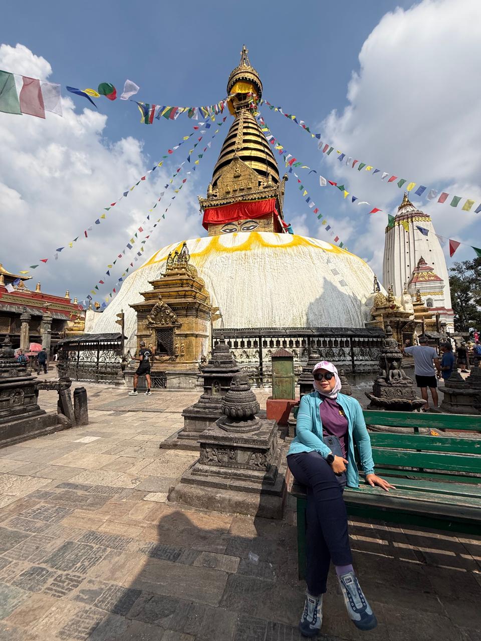 Pagi itu kami mulai dari Swayambhunath Stupa, stupa besar di puncak bukit yang dikenal dengan mata Buddha menatap ke segala arah. Untuk mencapainya, kami menaiki ratusan anak tangga sambil memperhatikan monyet-monyet yang bebas berkeliaran. Begitu sampai di atas, pemandangan lembah Kathmandu terbentang luas di bawah langit biru. Aroma dupa bercampur angin pagi menciptakan suasana damai dan sakral.
