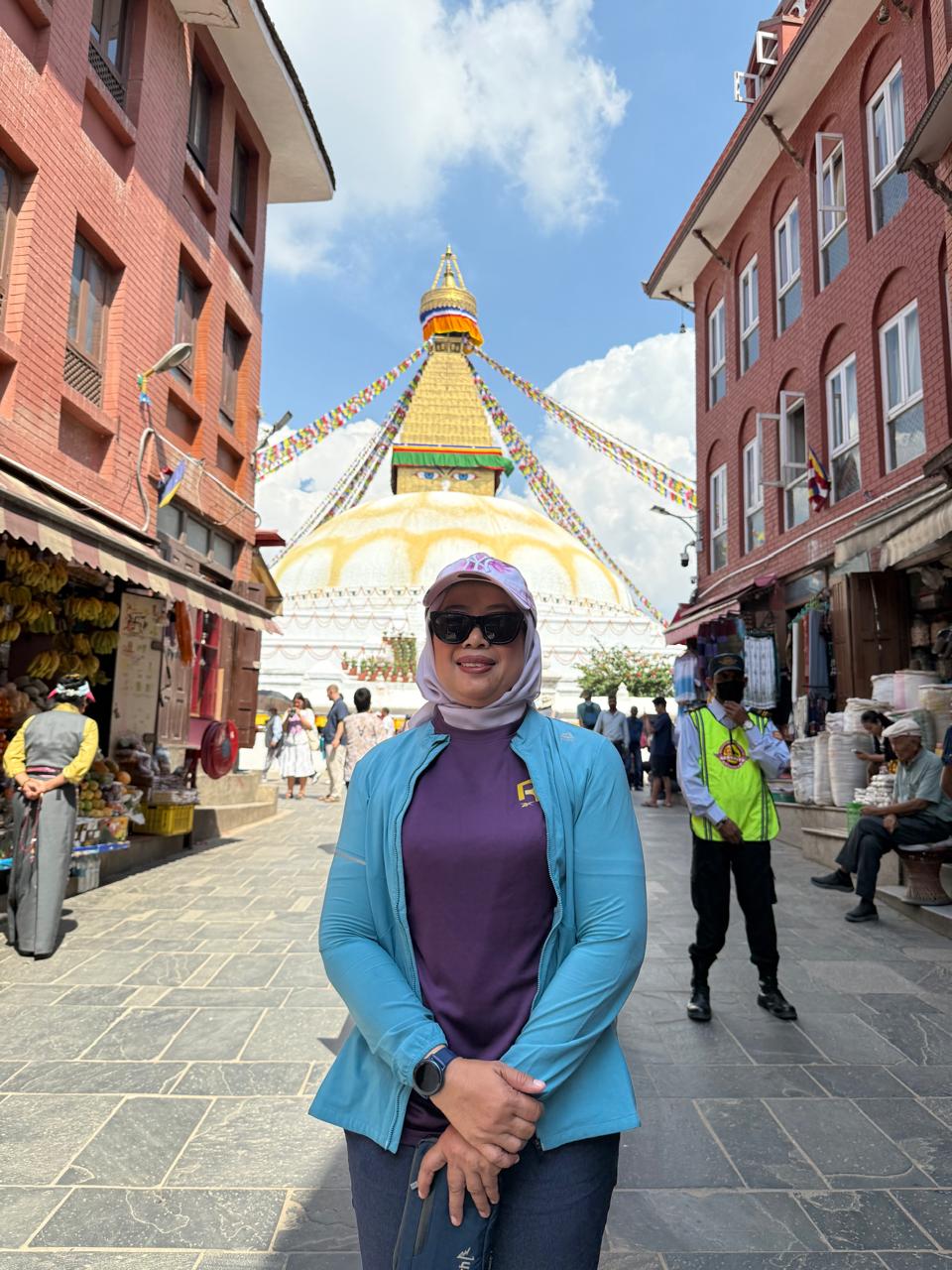 Dari sana, kami menuju Boudhanath Stupa, situs suci bagi umat Buddha Tibet. Stupa besar berwarna putih dengan mata Buddha di empat sisinya ini dikelilingi biara, kafe, dan toko suvenir khas Tibet. Kami tidak sempat masuk ke area dalam, tapi suasana spiritual di sekitarnya sudah sangat terasa.