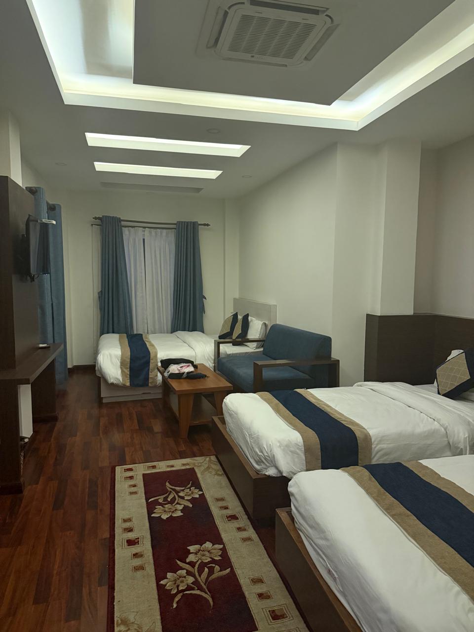 Kami baru memesan hotel menjelang pesawat lepas landas. Pilihan jatuh pada Hotel Mega di kawasan Thamel, dengan tarif sekitar 425 ribu/malam untuk kamar bertiga, sudah termasuk sarapan. Kamarnya luas, lengkap dengan dapur mini. Biasanya saya senang bisa masak sendiri, tapi kali ini kami memutuskan istirahat dan menikmati makanan lokal saja, toh makanan halal di Kathmandu mudah ditemukan. Sarapannya minimalis dalam porsi terbatas tapi cukup lengkap, enak dan mengenyangkan.