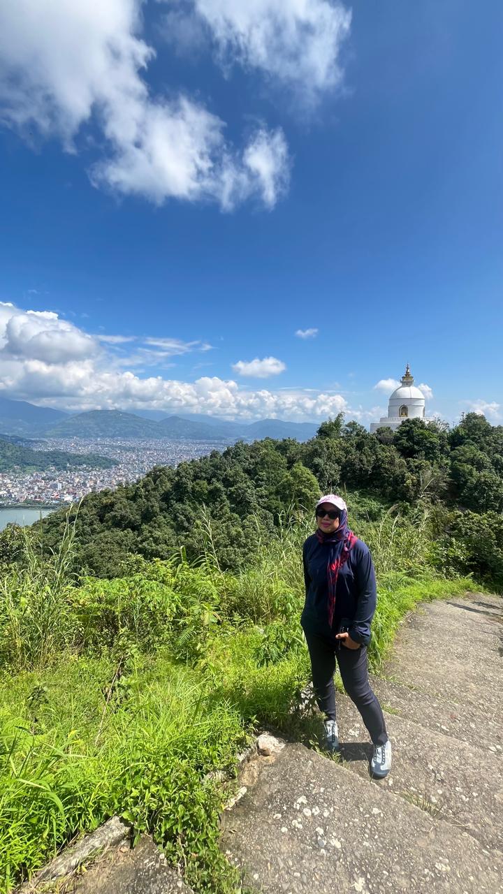 Stupa berwarna putih bersih itu berdiri anggun di punggung bukit, menghadap langsung ke Danau Phewa. Dari sini, terlihat perahu-perahu kecil melintas di atas air dan siluet gunung Machhapuchhre di kejauhan. Suasananya damai, cocok untuk berhenti sejenak, duduk di tangga pagoda, dan menikmati angin lembut yang bertiup dari arah danau.